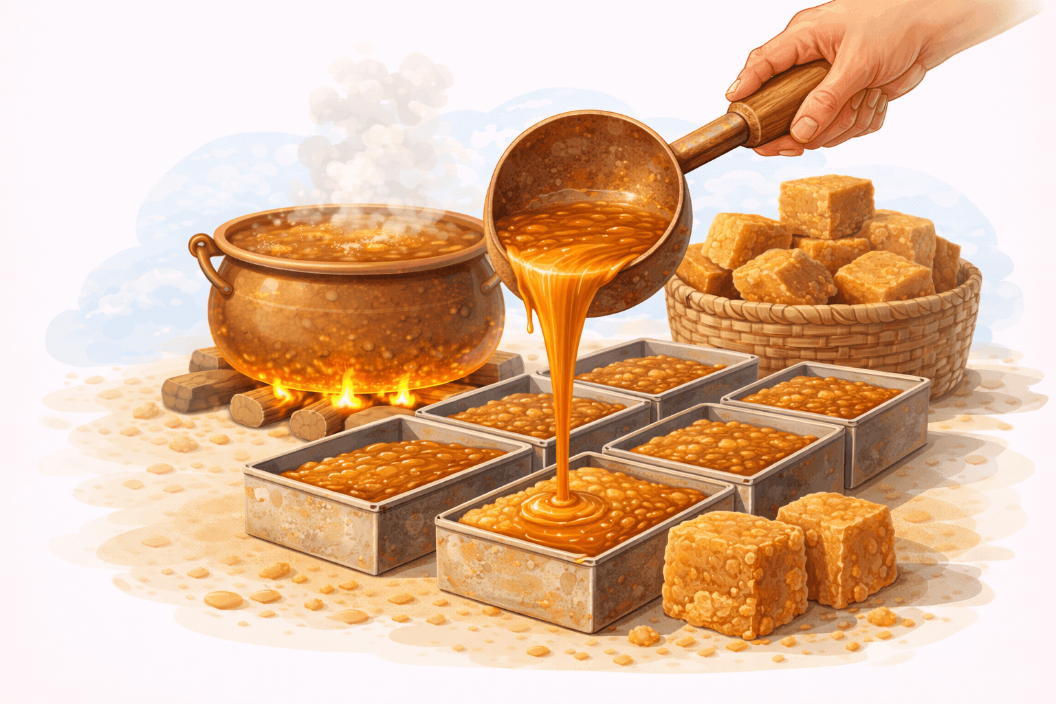 Once the juice reaches the right thickness, it is carefully hand-poured into moulds, preserving its natural texture and warmth.